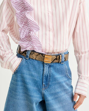 Chemise à rayures 100 % coton / coupe large et structurée / col pointu classique / détail volant en cascade sur le devant / ourlet arrondi à porter rentré ou non