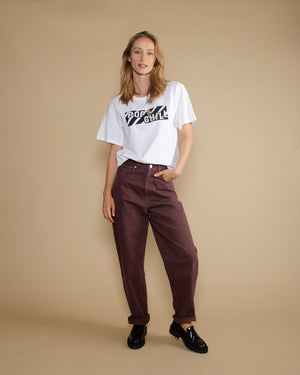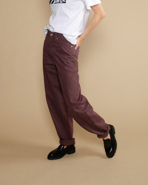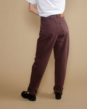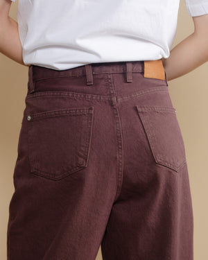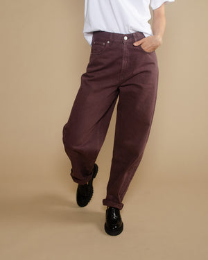 Un jeans pour femme couleur bordeaux de la marque Laurence bras. Avec un tee shirt blanc basique, le look sera simple et efficace ! La coupe droite et oversize de ce jeans est ultra tendance.