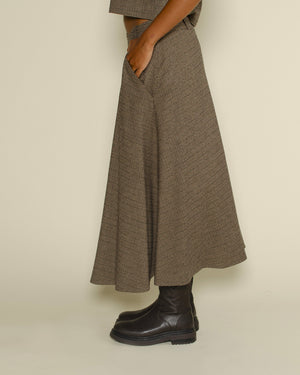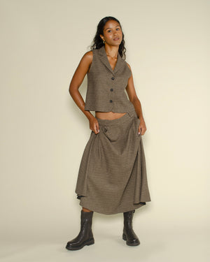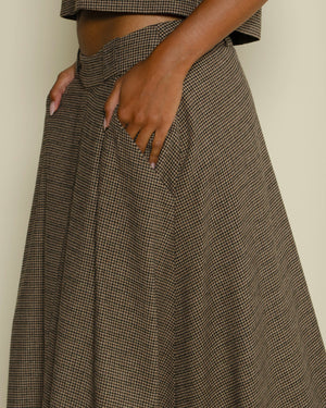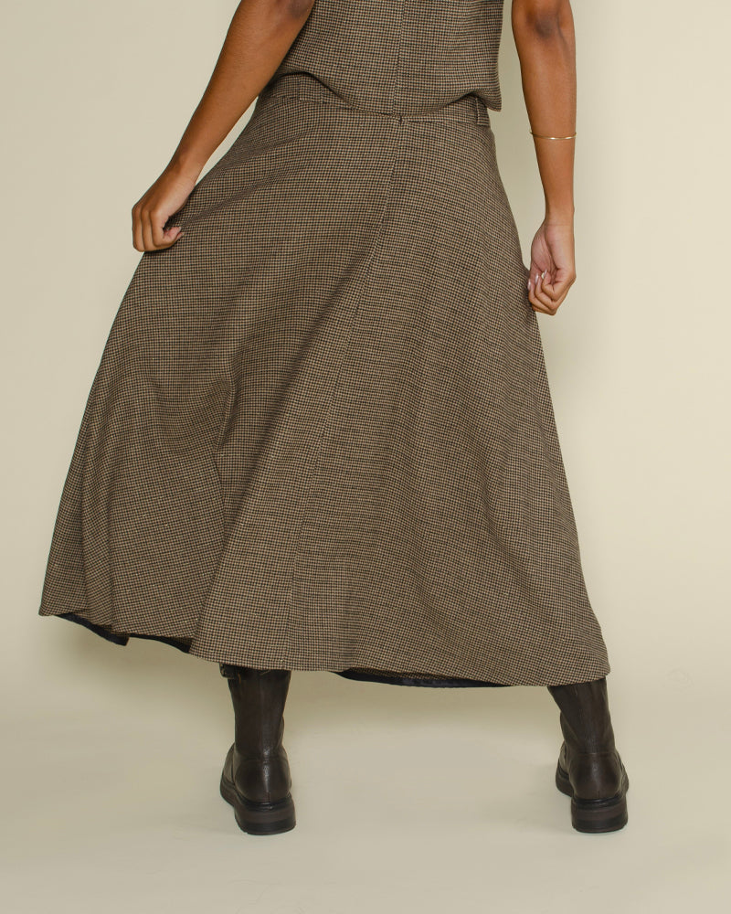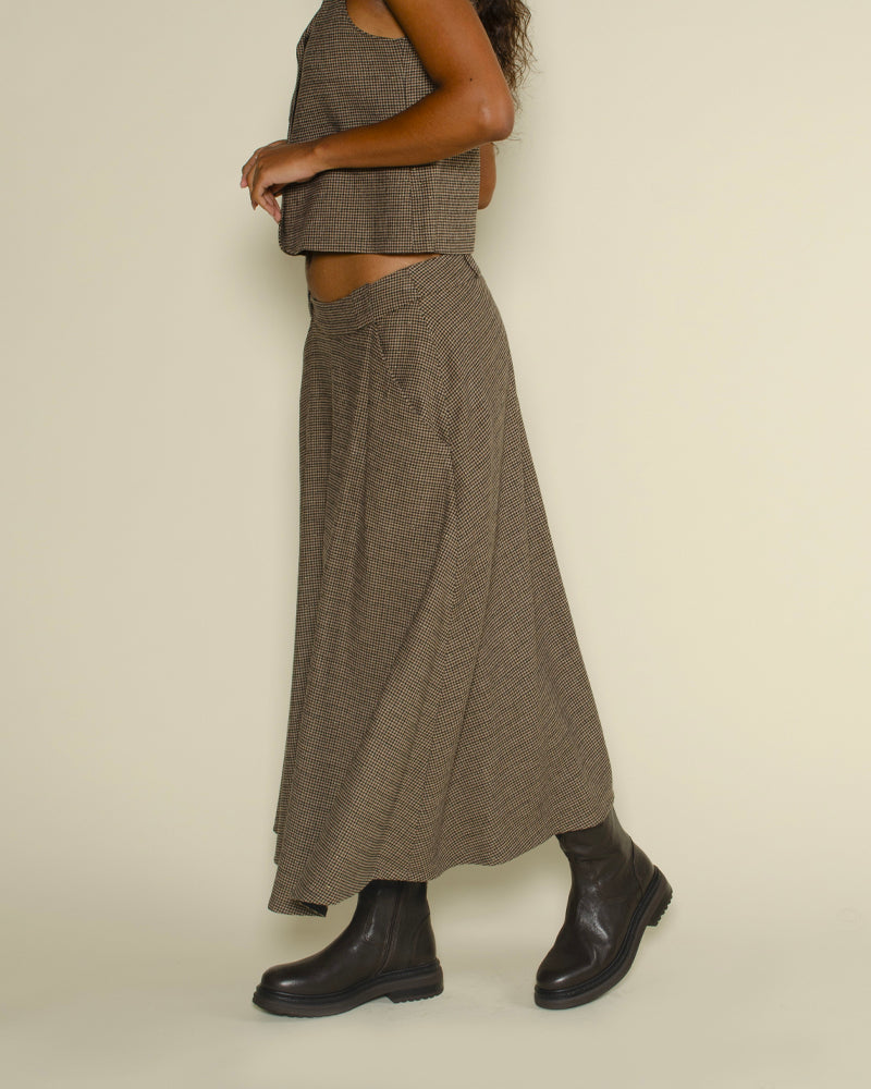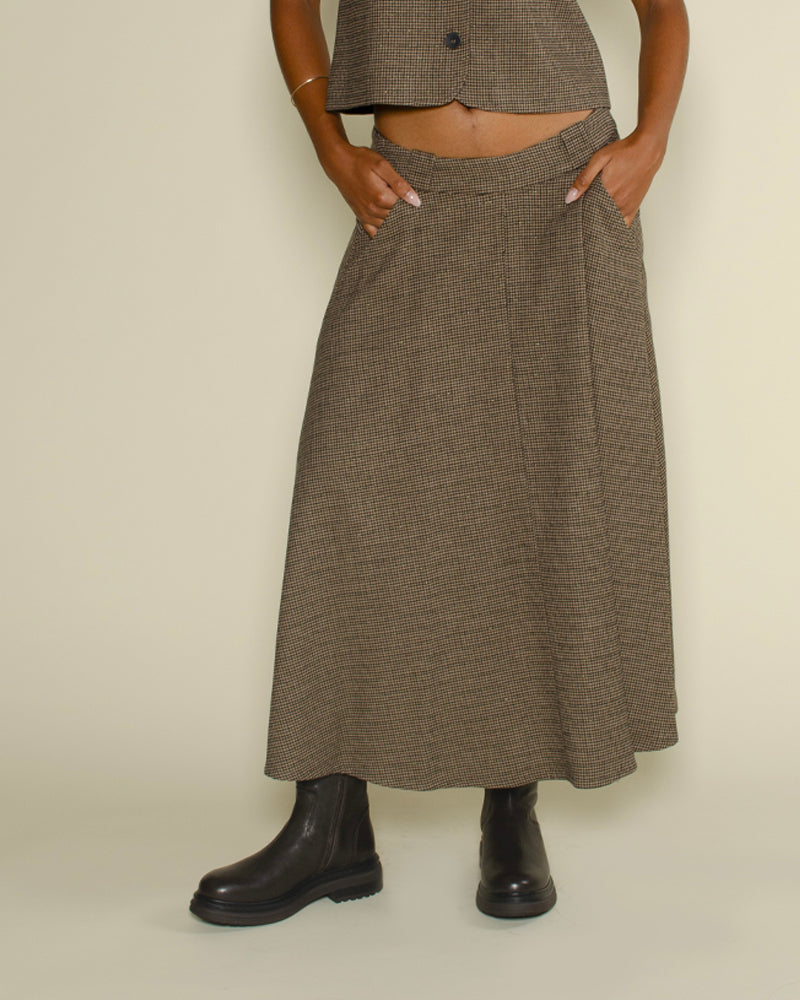 Petits carreaux chocolat / Taille élastique avec passants / Deux poches latérales / Coupe longue / Tissu léger et fluide / Style casual chic