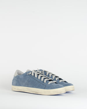 Cette basket basse pour homme signée P448 est en cuir effet velours. Des baskets facile à assortir avec vos tenues du quotidien. Les lacets sont bleu ciel et la semelle est légèrement grise.