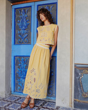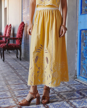 On adore cette jupe La Petite Mendigote pour sa coupe élégante, ses détails ajourés et brodés qui illuminent la silhouette. Un indispensable pour une touche bohème et raffinée !