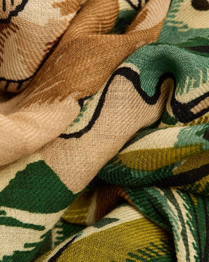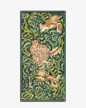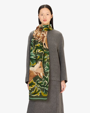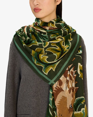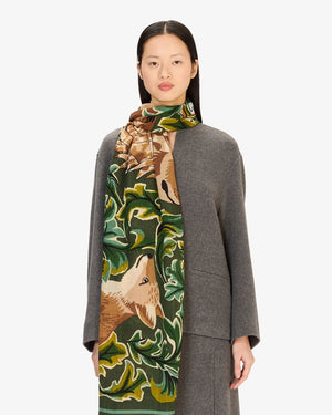 Écharpe rectangulaire / Motifs lion et renard / Fond feuillage vert / Bordure contrastée sombre