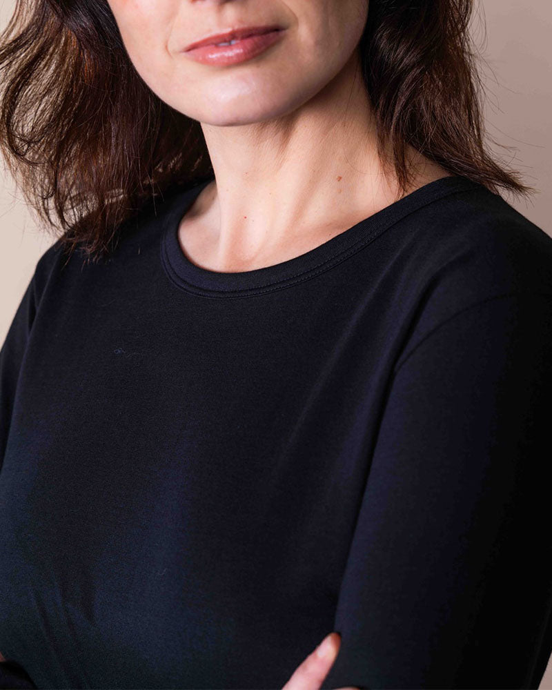 Ce t-shirt blanc pour femme de la marque Anonym a un toucher irrésistible. Son effet seconde peau et ses fibres 100 % biologiques permettent à ce t-shirt de se porter aisément sous un pull et de résister au froid de l'hiver !
