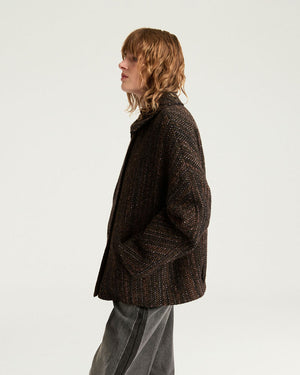 coupe ajustée / manteau court caban / laine bouclée/ manches kimono arrondies / sous-col et des revers au bas des manches / poches passepoilées et boutons en corne
