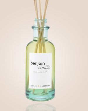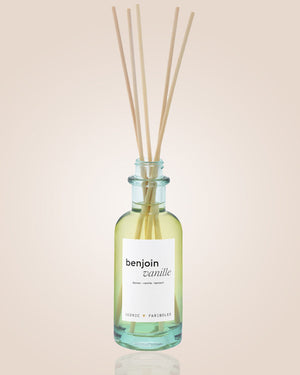 Un diffuseur mikado de la marque Fariboles qui embaumera votre intérieur d'une odeur enivrante et cocooning avec son mélange de vanille, d'épices et de benjoin.