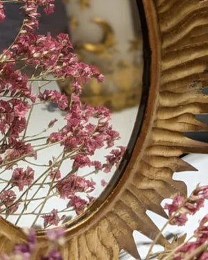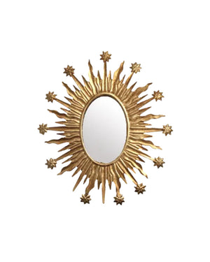Miroir céleste doré de la marque Boncoeurs. Cette année on craque sur la tendance des astres dans la mode comme la décoration. On adore ce miroir céleste pour son style baroque et symbolique qui apportera de la luminosité et de la chaleur à vos murs. Fabriqué à la main, ce miroir céleste est une véritable pièce unique et délicate.