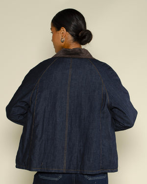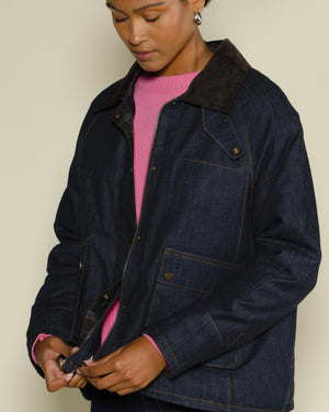 Veste Oakwood en denim brut / Coupe droite casual / Col contrastant en velours côtelé marron / Fermeture boutonnée à pressions / Grandes poches à rabat pratiques / Denim épais et résistant pour un confort durable