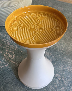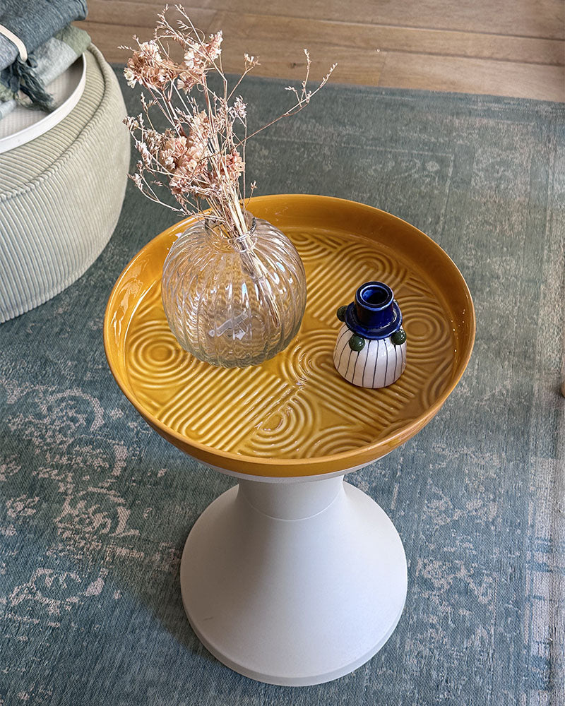 Les Plateaux sont des pièces uniques, chaque plateau peut présenter des irrégularités suite à la peinture de l'acier. Le tabouret présenté sur la photo n’est pas inclus avec le plateau.