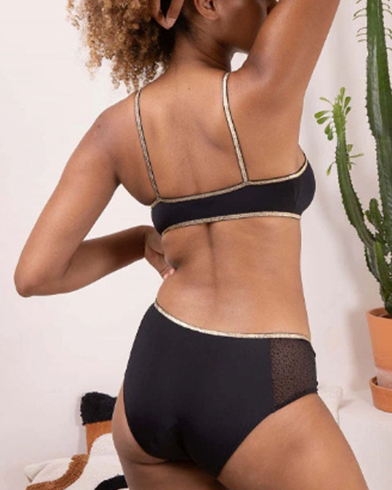 Allier style, féminité et pratique avec les shortys menstruels Moon ! Conçues pour éviter les fuites grâce à ses couches absorbantes en coton et en fibres de bambou. Idéal pour la nuit, son flux abondant est équivalent à 3-4 tampons normaux ou 2 tampons ultra absorbants. On est fan de l'élastique doré et la dentelle noire, les codes signatures de la marque ! Le shorty Moon existe également en flux moyen.