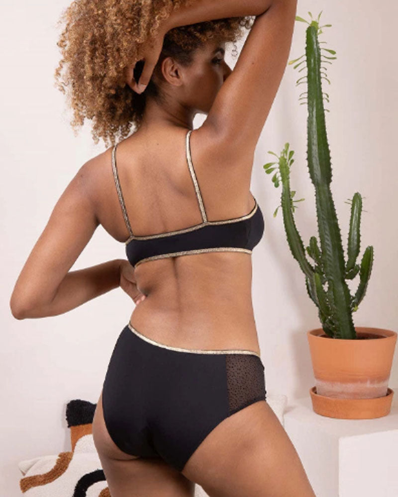 Allier style, féminité et pratique avec les shorty menstruels Moon ! Conçus pour éviter les fuites grâce à ses couches absorbantes en coton et en fibres de bambou. Son flux moyen est équivalent à 2 tampons normaux ou 1 tampon ultra absorbant. Les tissus sont choisis avec soin pour favoriser le confort et rester à l'aise tout au long de la journée. On est fan de l'élastique doré et la dentelle noire, les codes signatures de la marque ! Le shorty menstruel Moon existe également en flux abondant.