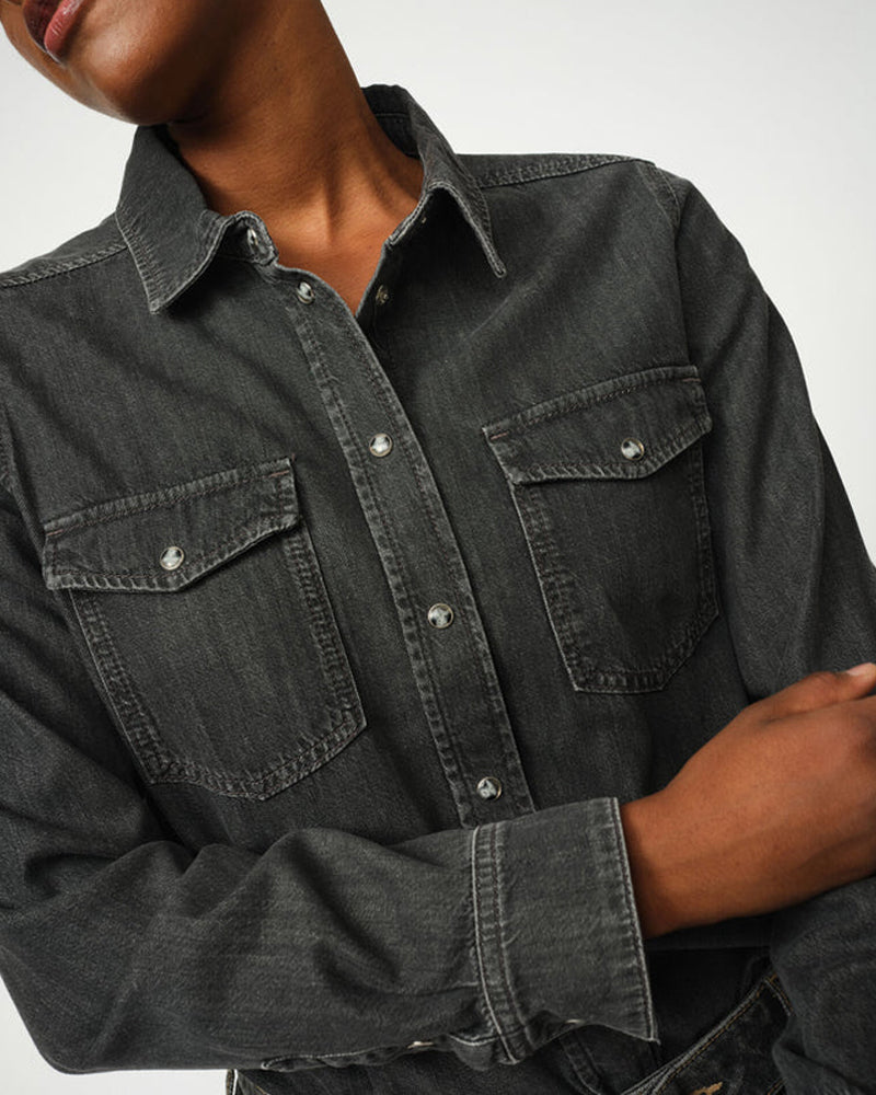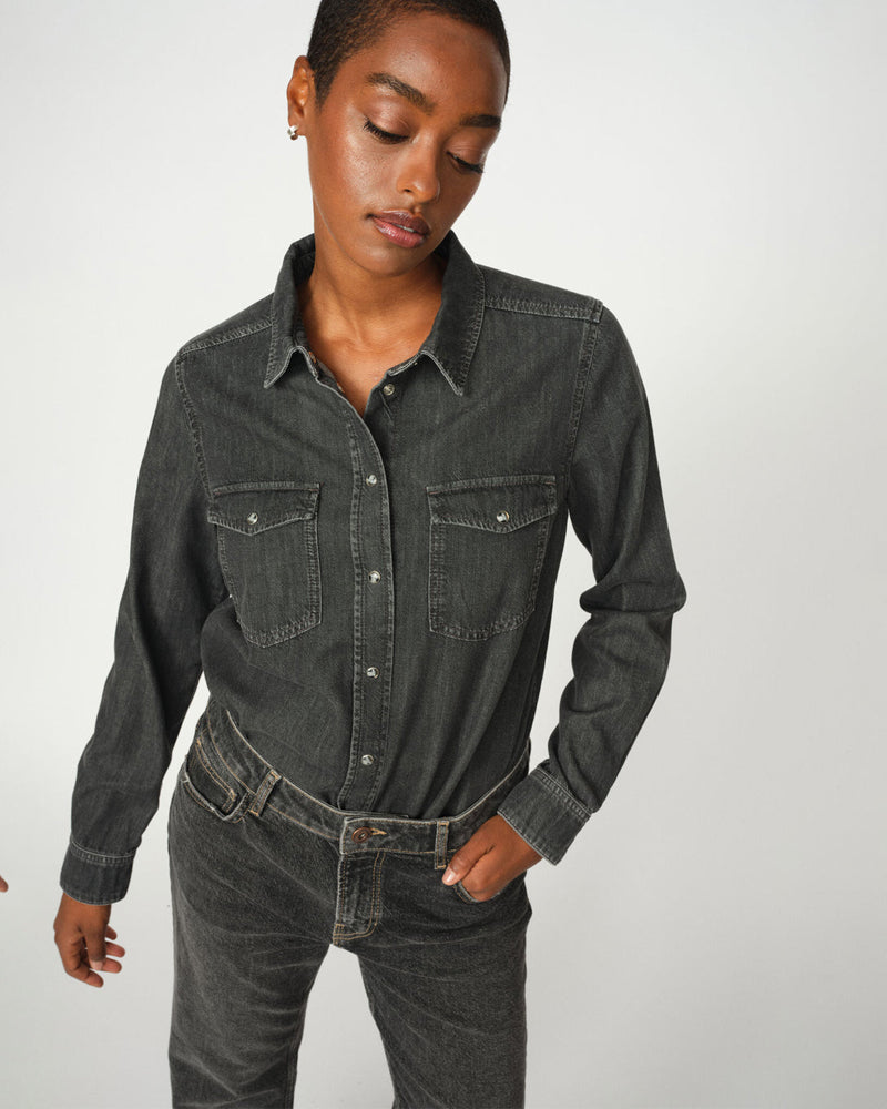 Chemise en denim noir / col classique / poches poitrines / chemise femme