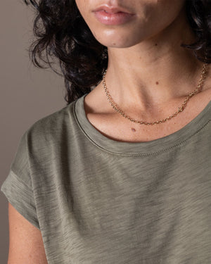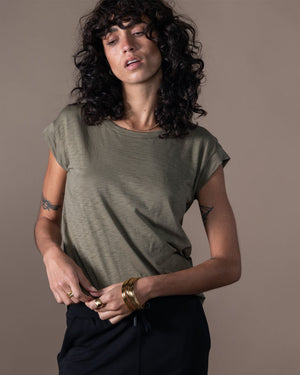 Tee-shirt col rond / décolleté en jersey / petites manches courtes / coupe droite.