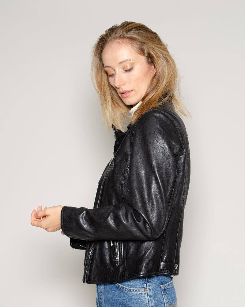 Le perfecto en cuir noir de la marque Rose Garden vous attend pour la mi-saison ! C'est un basique à avoir dans votre garde robe. Il s'associe très facilement et apporte un effet rock et chic à vos tenues ! Retrouvez tous les blousons ici.