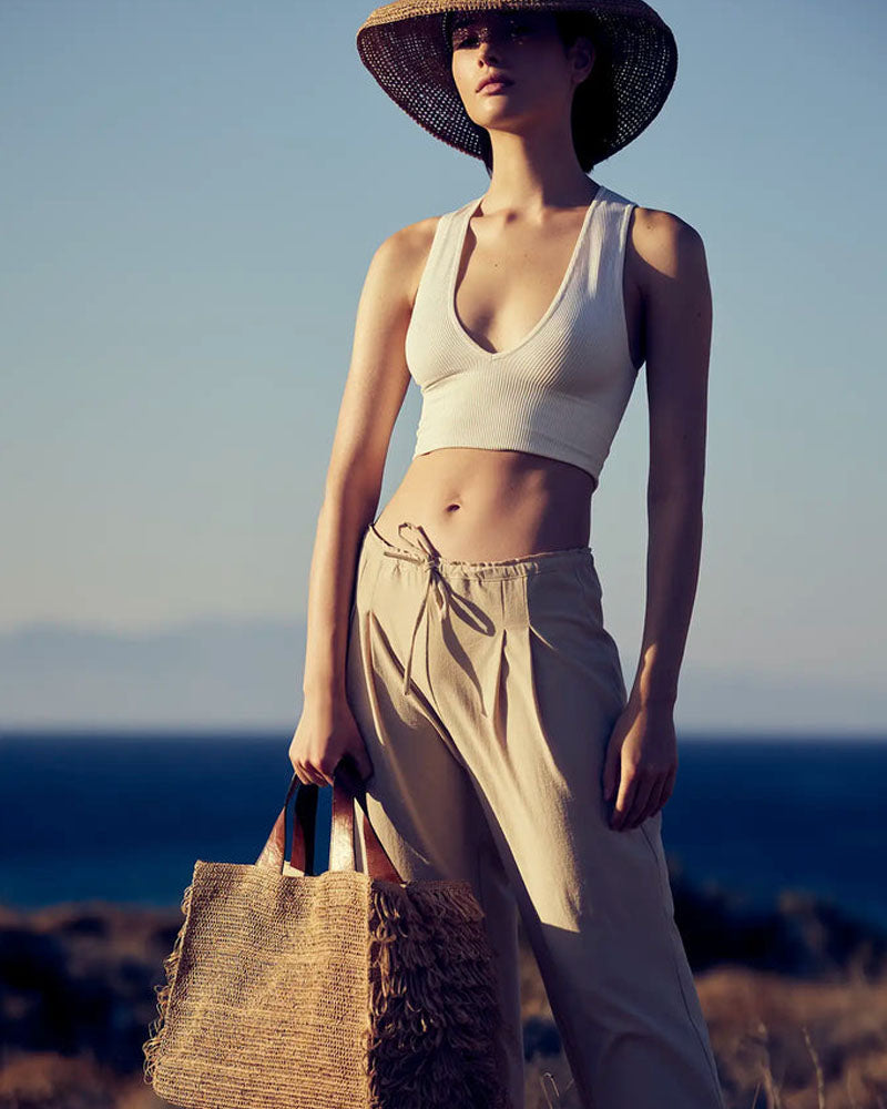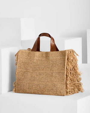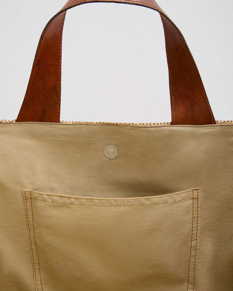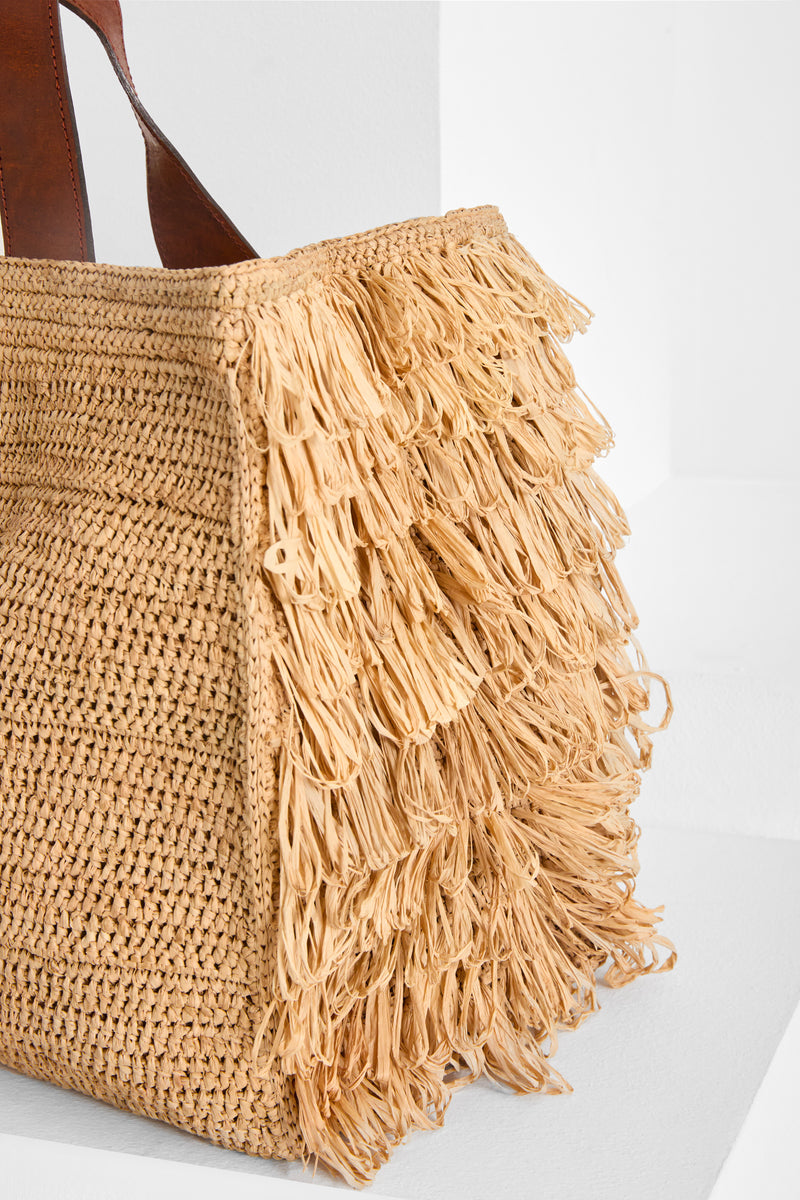 Composition: 100% raphia naturel (matière naturelle et durable). Les poignées sont en cuir de zébu tanné selon un procédé végétal.