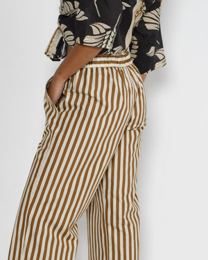 Un pantalon Pantero de couleur camel rayé et de la marque Diega. Ce pantalon Pantero est un pantalon style tailleur. On craque pour son coloris camel et beige !