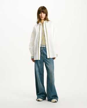 Une chemise blanche brodée pour femme de la marque Momoni. On adore cette chemise pour femme parfaite pour un look chic et audacieux ! Coup de coeur pour les broderies sur le col et les manches. Retrouvez la en bleu ici !