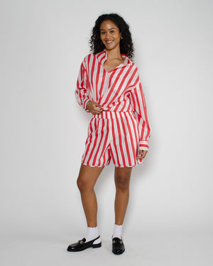 Un short rouge à rayures pour femme de la marque Petite Mendigote. Un modèle ultra-confortable et tendance, idéal pour vos journées ensoleillées ! Retrouvez l’ensemble complet, incluant la chemise assortie, ici.