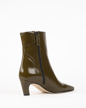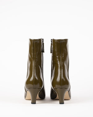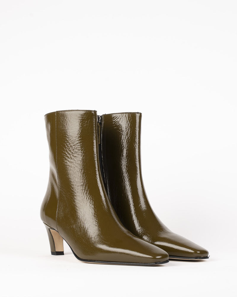 Cuir verni kaki / Finition brillante texturée / Bout pointu / Talon moyen galbé / Silhouette féminine / Élégance affirmée / Style rétro chic / Parfaites pour sophistiquer un look de saison