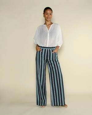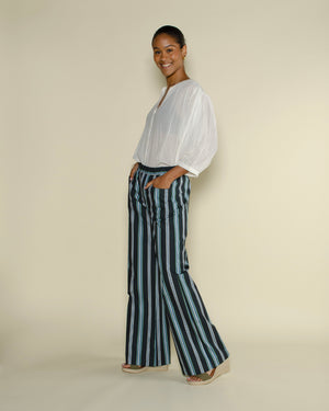 Le pantalon Pindo à rayures vertes est en coton. Il a une coupe volontairement large pour apporter de la légèreté et de la modernité au look. A adopter avec une chemise ample ou un t-shirt simple pour avoir le look parfait cet été !