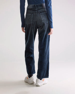 Coupe ajustée aux hanches / Très haute taille, jambes larges / Denim de poids moyen, sans élasticité / Denim de coton à rinçage noir / Braguette zippée