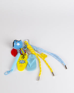 Ce bag charm aux couleurs bleu et jaune est un concentré de bonne humeur ! Confectionné spécialement pour les 15 ans de Pop, il se compose de mini breloques fun comme une petite tong, un casque ou une bouche. L’accessoire parfait pour donner du peps à vos sacs !