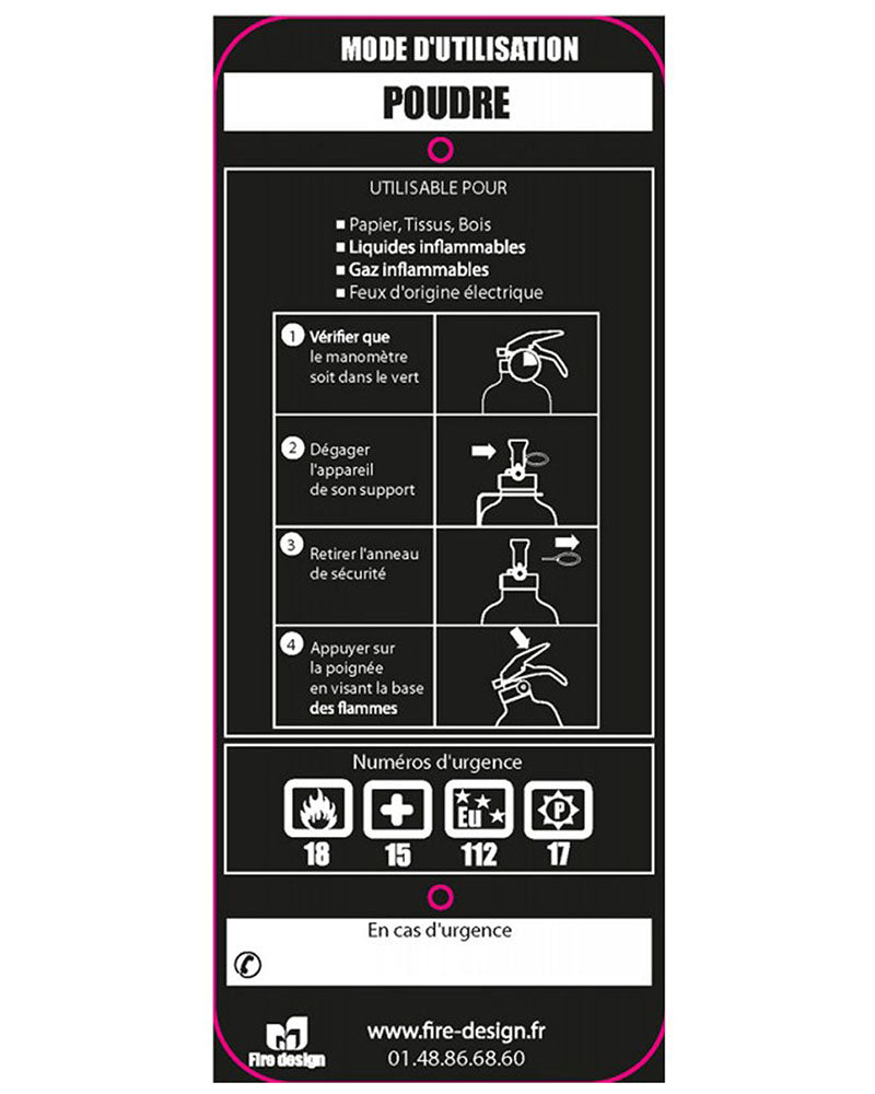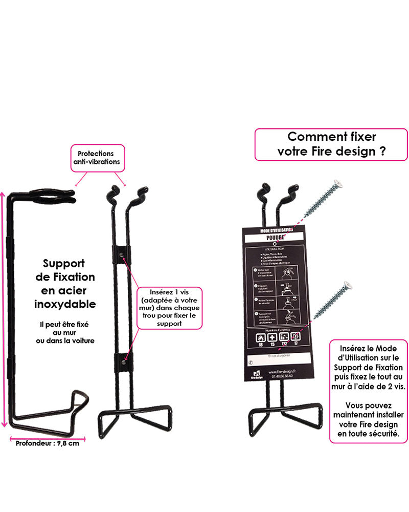 Chaque Appareil d'Extinction Fire design est vendu avec son support de fixation.Vous pouvez le fixer au mur (recommandé) et vous pouvez aussi l'utiliser pour le fixer dans votre automobile.