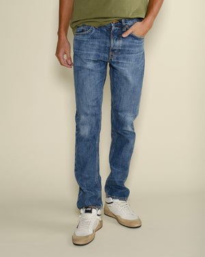 Coupe ajustée / Denim stretch texturé / Bleu délavé / Effet usé authentique