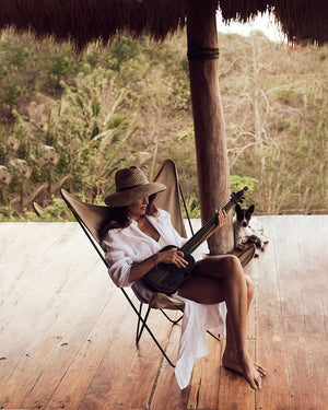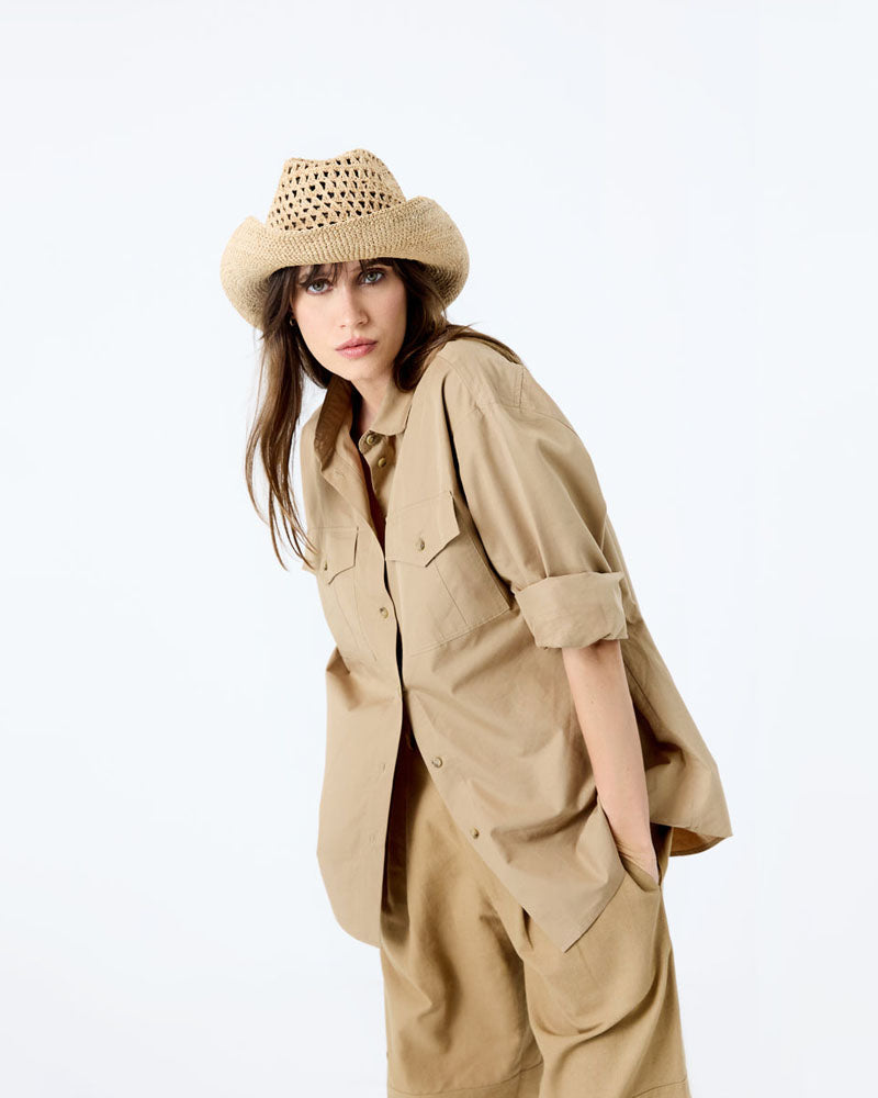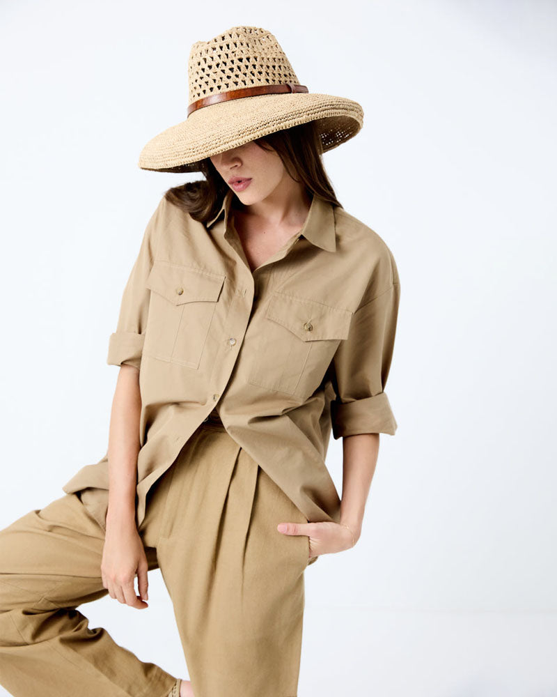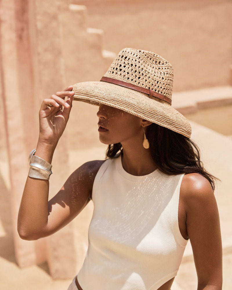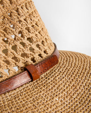 Composition: 100% en raphianaturel, doublé d’une bande en coton bio au niveau du tour de tête intérieurl. Lanière en cuir de zébu tanné selon un procédé végétal.