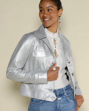 Découvrez la veste sourci argentée effet cuir Oakwood, une pièce unique alliant sophistication et audace. Conçue avec un effet cuir métallisé argenté, cette veste apporte une touche de modernité à votre garde-robe. Sa coupe impeccable et ses détails raffinés font d'elle un vêtement polyvalent, idéal pour des occasions formelles ou décontractées.
