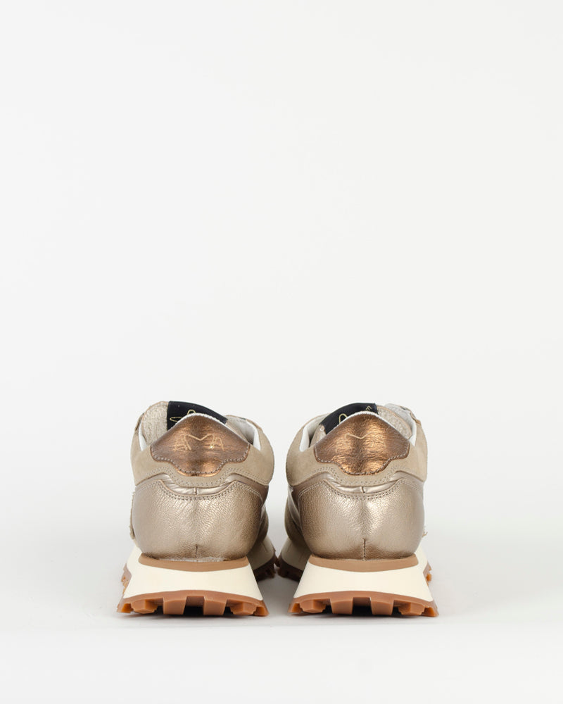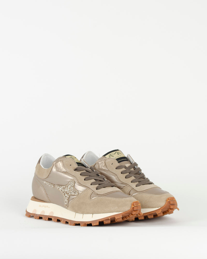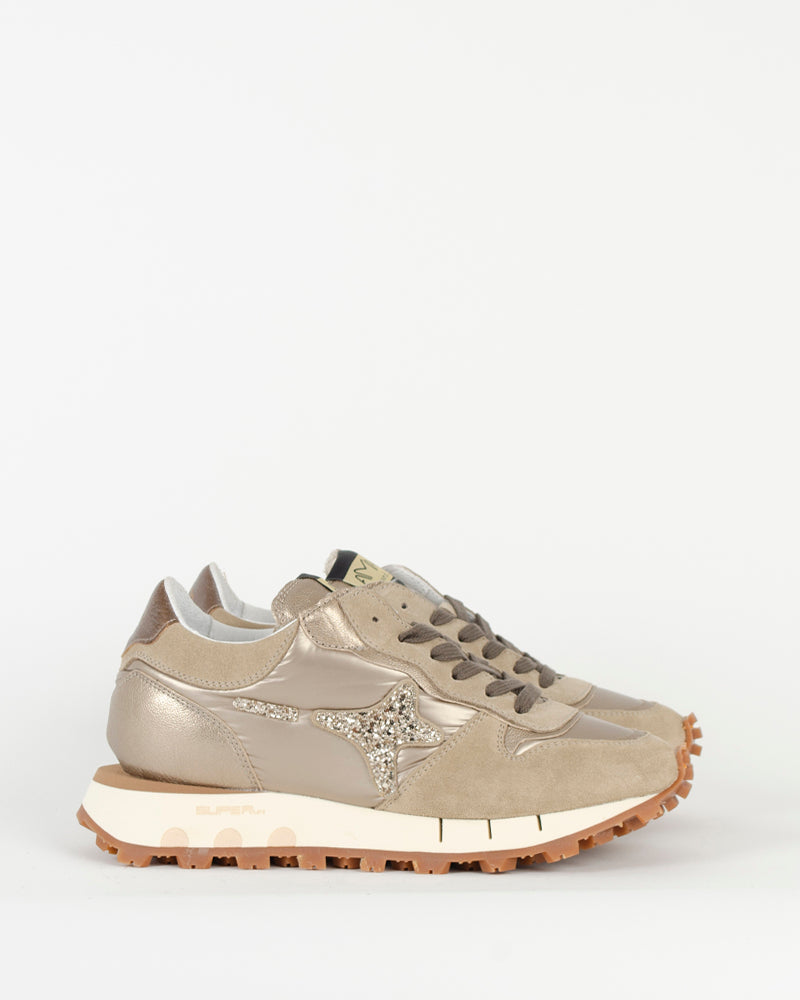 Une paire de baskets runnings pour femme de la marque Ama Brand idéale pour la saison.Avec ses tons chauds et son cuir suédé, elles sont super tendances ! Vous allez adorer la semelle épaisse et les paillettes pour le chic !