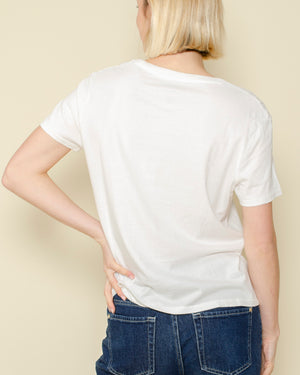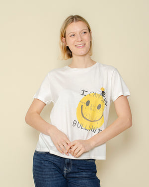 Col rond / forme ample / smiley jaune / badges signature de la marque
