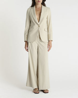 Une veste beige pour femme de la marque Hana San. La veste Talma allie structure et fluidité avec son col cranté fermé par un bouton en corozo. Ses poches à rabat apportent une touche pratique et élégante, tandis que les manches ornées de cinq boutons ajoutent un détail soigné. Doublée pour un confort optimal, sa coupe droite offre une silhouette moderne. Retrouvez ici le pantalon assorti pour un look 100% Hana San.
