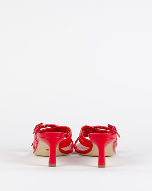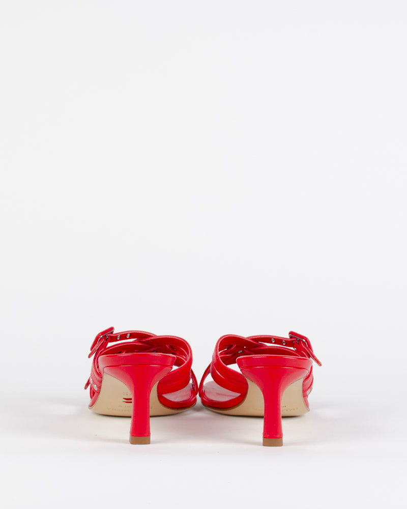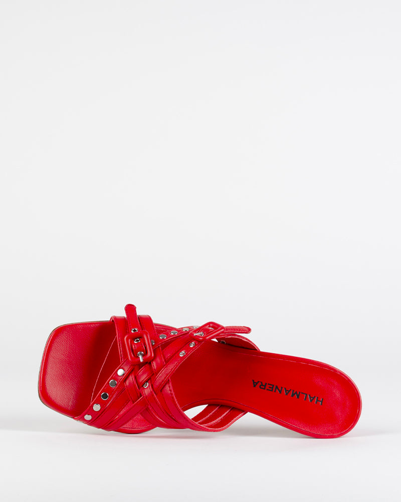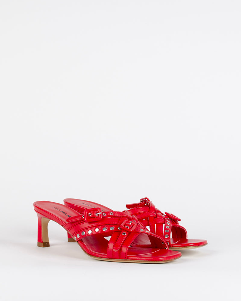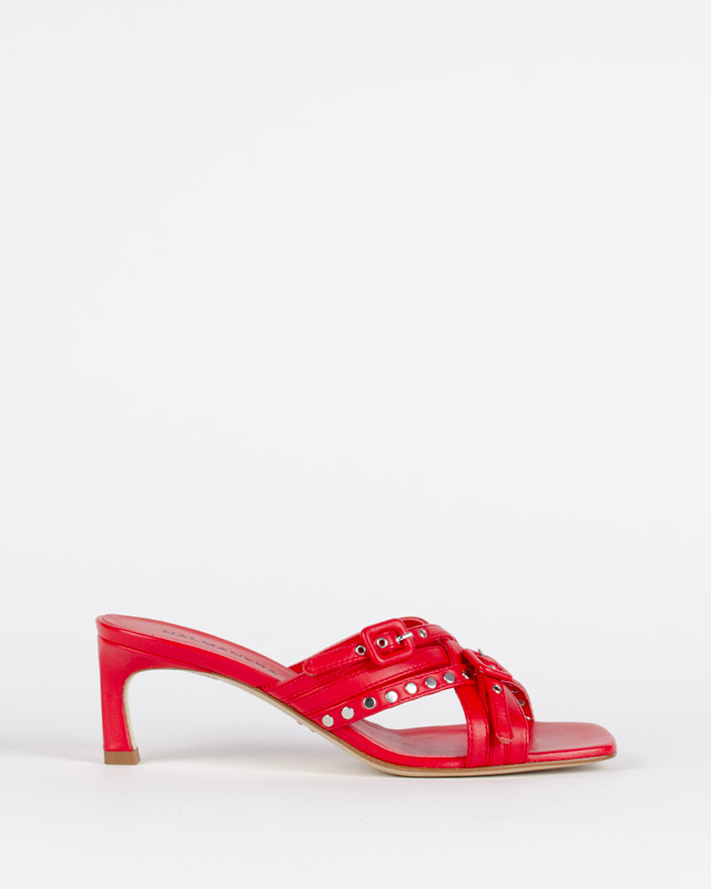 Ces mules rouges sont un "must have" de la saison. Les brides lui confère un côté passe partout et élégant, facilement cassable avec un jean oversize.