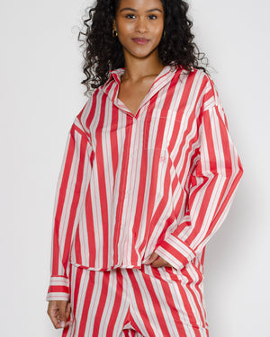 Une chemise rouge à rayures pour femme de la marque Petite Mendigote. Avec sa coupe oversize et sa matière légère, elle apporte une touche de sophistication à toutes vos tenues. Parfaite pour vos sorties décontractées ! Retrouvez l’ensemble complet, incluant le short assortie, ici.