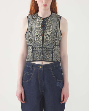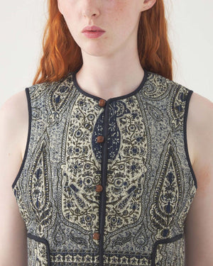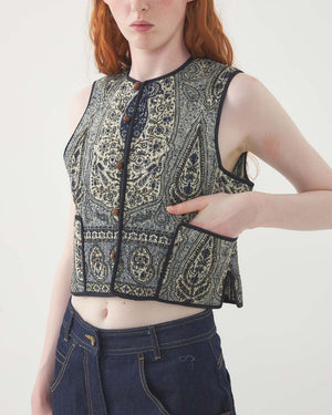 Un gilet à motifs sans manches pour femme de la marque Antik Batik. Ce gilet pour femme à l'esprit bohème est parfaite pour cet été. On adore les beaux boutons de ce gilet pour femme.