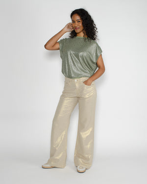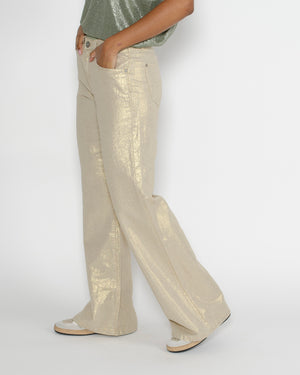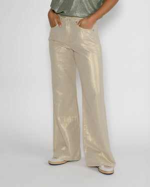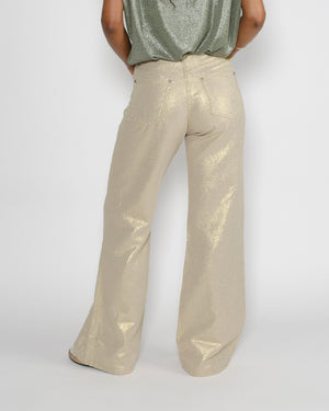 On adore ce pantalon flare en lin doré de la marque Denim Studio pour sa coupe élégante et sa matière légère. Sa teinte lumineuse apporte une touche sophistiquée et ensoleillée à toutes vos tenues !