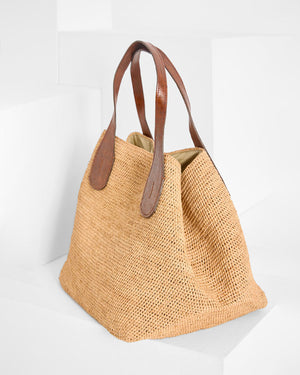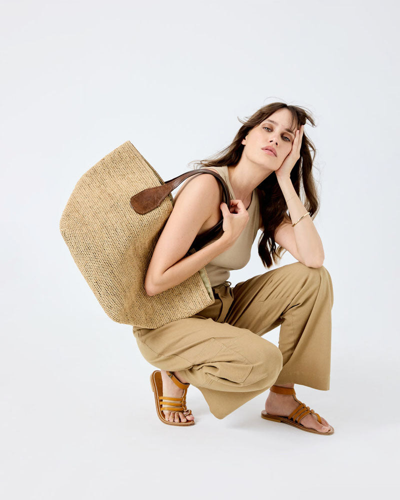 Composition: 100% raphia naturel (matière naturelle et durable). Les poignées sont en cuir de zébu tanné selon un procédé végétal.