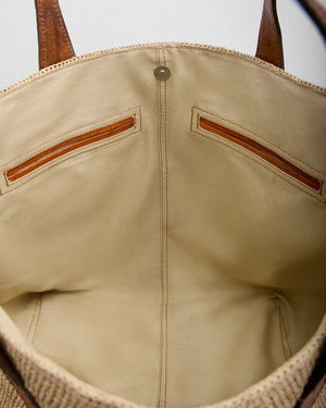Dimensions: Cabas de taille moyenne (55 cm long, 29 cm de haut, fond 29 cm x 29 cm). Poignées de 18 cm en cuir doublé.