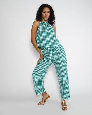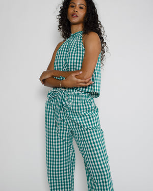 Un top vert à imprimé vichy pour femme de la marque Petite Mendigote. Avec sa coupe fluide et sa matière légère, ce top est idéal pour un look décontracté ou sophistiqué. Un véritable coup de cœur chez Pop And Shoes ! Retrouvez l’ensemble complet, incluant le pantalon assorti, ici.