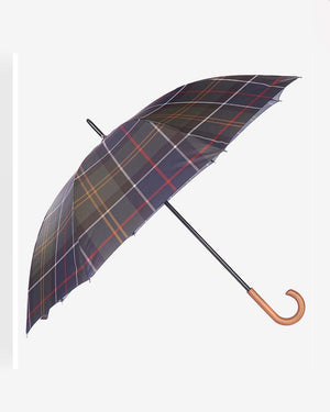 C'est un parapluie avec un imprimé tartan XXL signé Barbour. Il est doté d'une poignée en bois avec le logo de la marque gravé dessus.