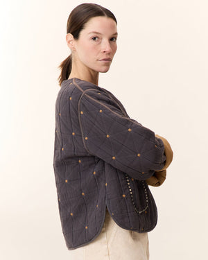 Veste matelassée de la marque Leon and Harper. On adore cette veste trop mignonne pour la saison printemps été 2025. Sa coupe boule et ses détails à clous la rendent super tendance.