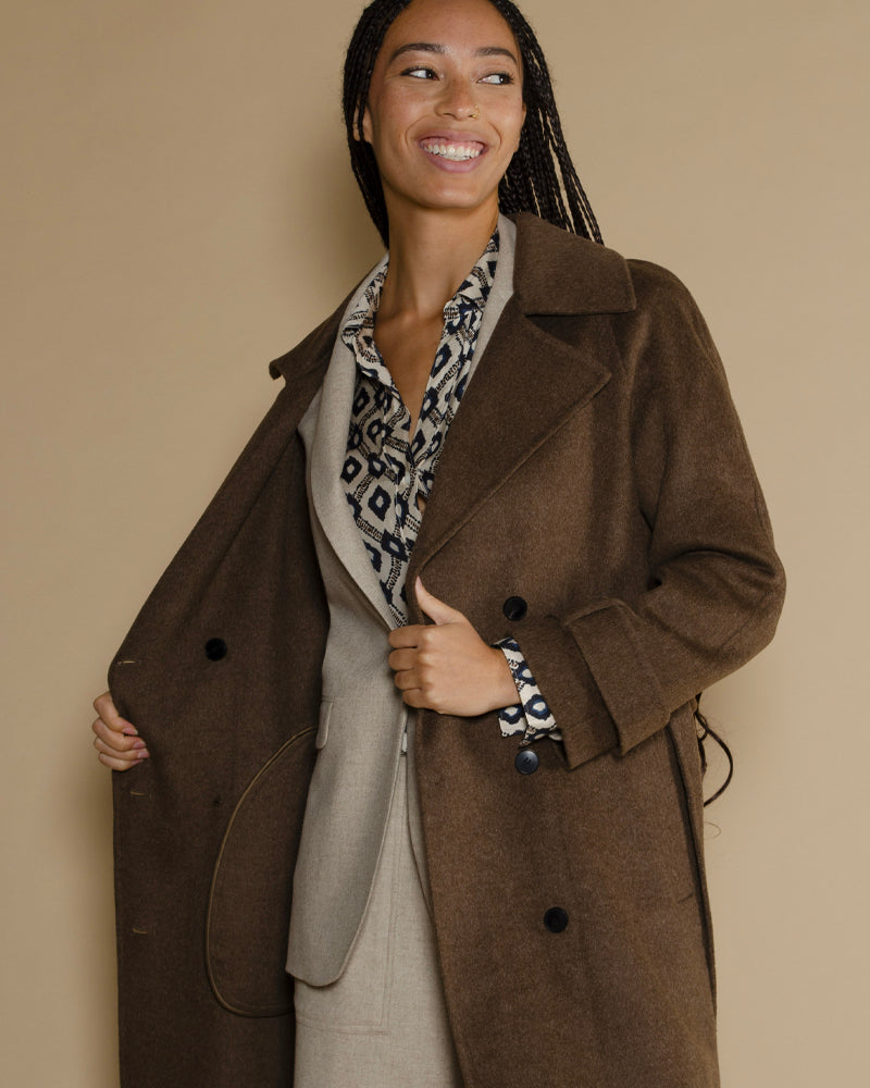 Manteau long pour femme de la marque Hartford. Ce manteau pour femme Hartford est parfait pour cet hiver 2025. Sa coupe longue permet de donner un côté élégant à cette pièce intemporelle, et la ceinture à la taille permet de renforcer sa féminité.
