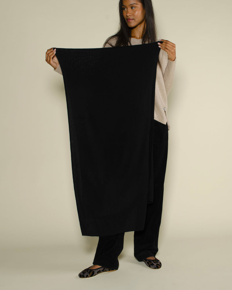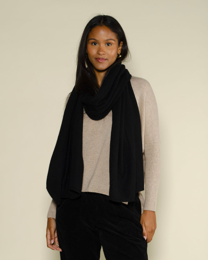 cachemire doux et chaud / teinte noire, sobre et intemporelle / accessoire essentiel / chic et polyvalent