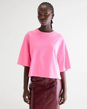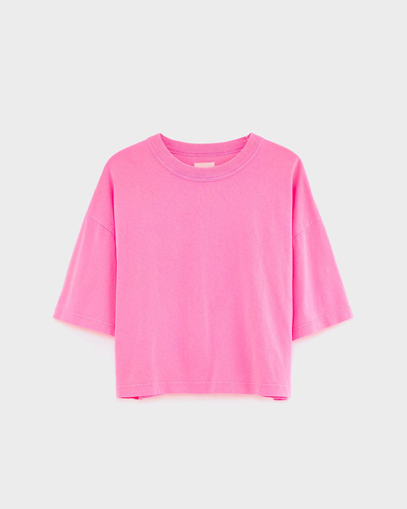 Coupe courte et décontractée / Col rond / Épaules tombantes / Manches courtes / Logo « bb » brodé en bas à droite