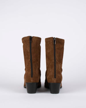 Boots camel en cuir suédé / talon effet tiag sculpté / ligne légèrement pointue/ allure féminine et moderne/ confortable