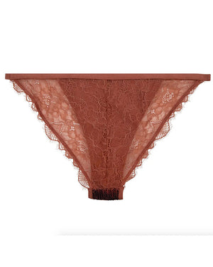 Culotte style tanga en sequins marrons, finition bordure festonnée, doublure en jersey de coton tout doux, fine dentelle florale semie-transparente à l'arrière.